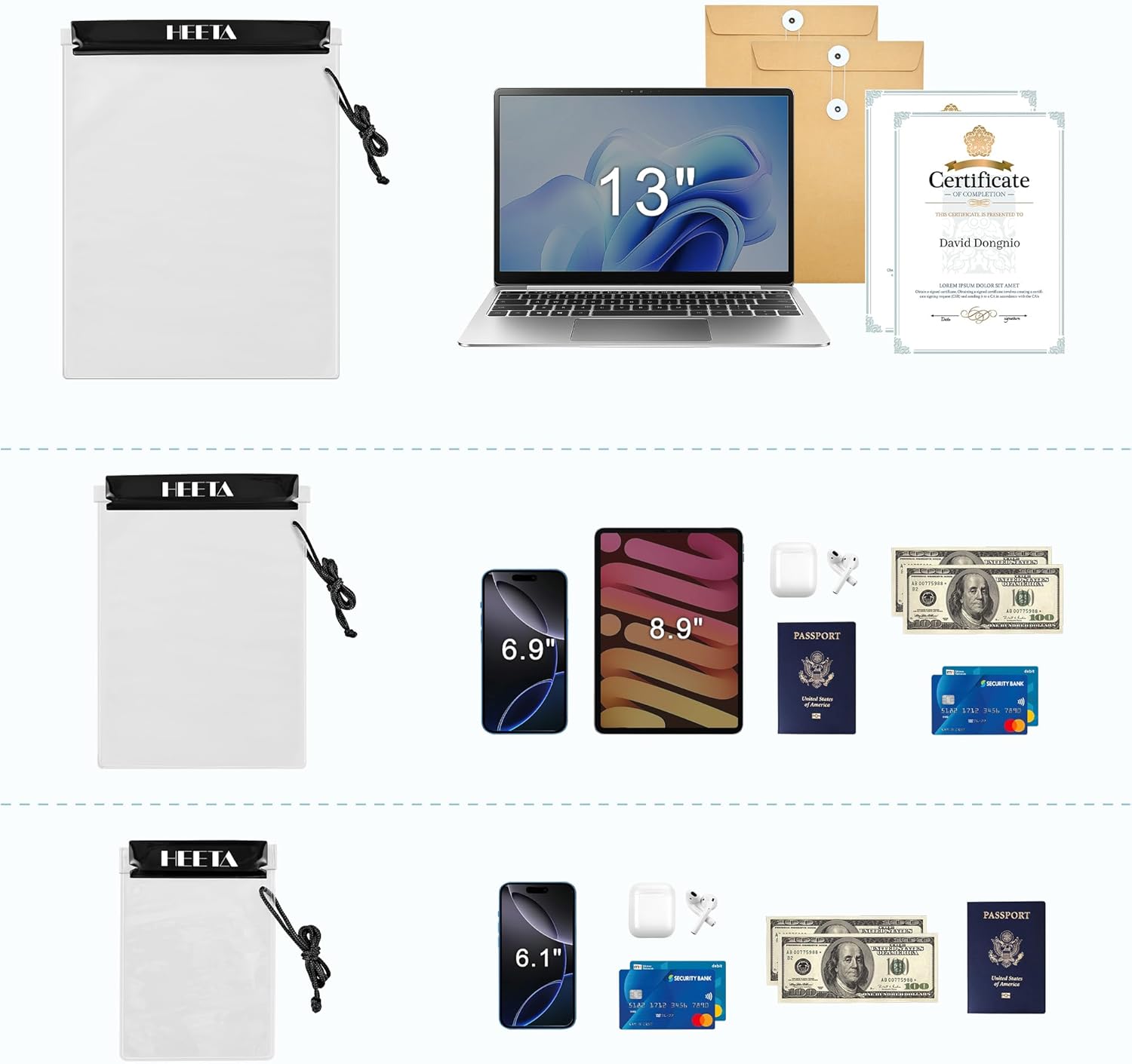 Each pack includes five clear waterproof dry bags in various sizes, providing versatility for storing different items. From small essentials like keys and cash to larger items such as tablets and passports, these pouches have you covered.